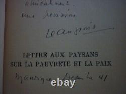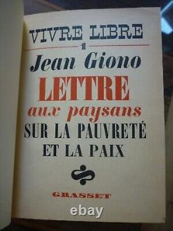 Giono Jean: Letter to the peasants on poverty and peace. 1", Grasset January 1939, In 8 half leather bound, ribbed spine, gold titles, preserved cover, an autographed dedication from Jean Giono TBE.